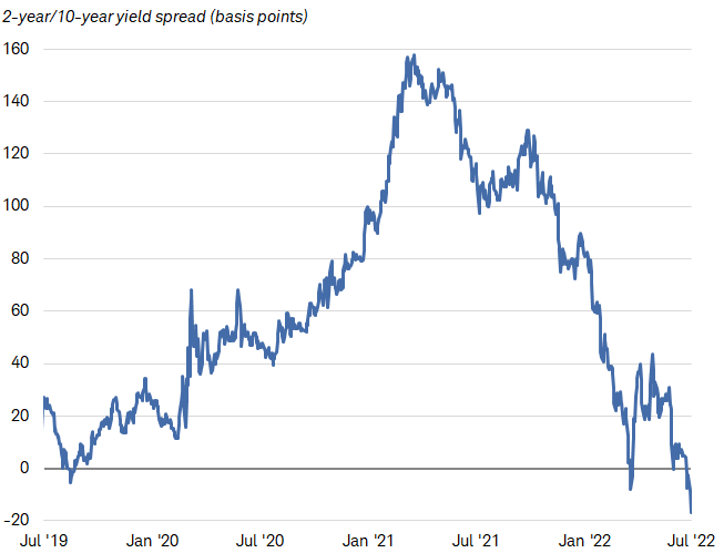 На графике показан спред доходности между двухлетними и 10-летними казначейскими ценными бумагами. В последнее время спрэд стал отрицательным, а это означает, что кривая доходности от двух до десяти лет перевернулась. По состоянию на 13 июля 2022 года спред был отрицательным на 17 базисных пунктов.