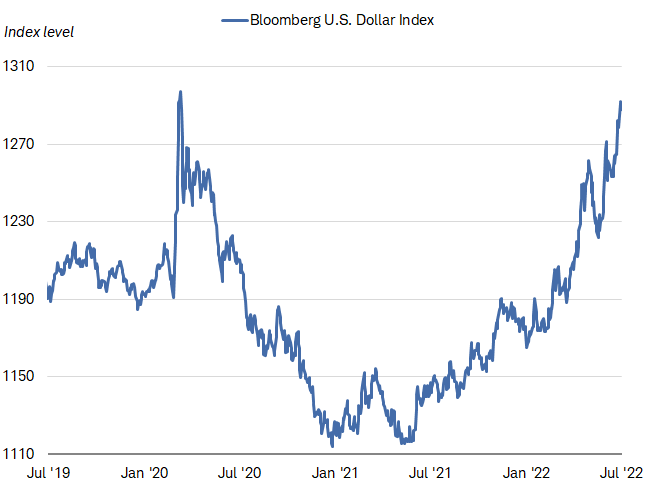 На диаграмме показан индекс доллара США Bloomberg с июля 2019 года по 13 июля 2022 года. 13 июля 2022 года индекс составлял 1288 пунктов.Автор: Эльвир, аналитик Freedman Сlub Crypto News